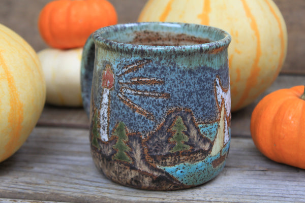 On my 10th birthday, my family drove north along the rocky, rugged coast of Maine, weaving in and out of small fishing towns, to Acadia National Park. It was an adventure full of hiking and icy ocean swims and blueberry pie and I will always love the wild world of coastal Maine. This mug design is in honor of Acadia National Park and all the joy that part of the world has brought me. Featuring a climbing rocky coastal cliff topped by a density of green foliage and a shining lighthouse beneath a high crescent moon.