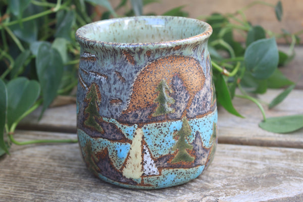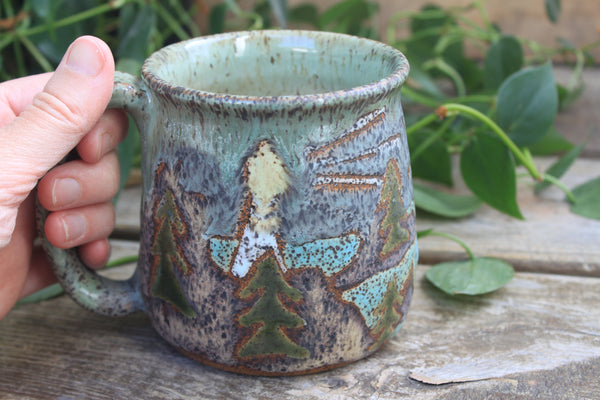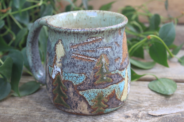 On my 10th birthday, my family drove north along the rocky, rugged coast of Maine, weaving in and out of small fishing towns, to Acadia National Park. It was an adventure full of hiking and icy ocean swims and blueberry pie and I will always love the wild world of coastal Maine. This mug design is in honor of Acadia National Park and all the joy that part of the world has brought me. Featuring a climbing rocky coastal cliff topped by a density of green foliage and a shining lighthouse beneath a setting sun.