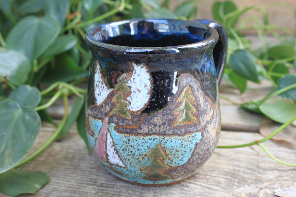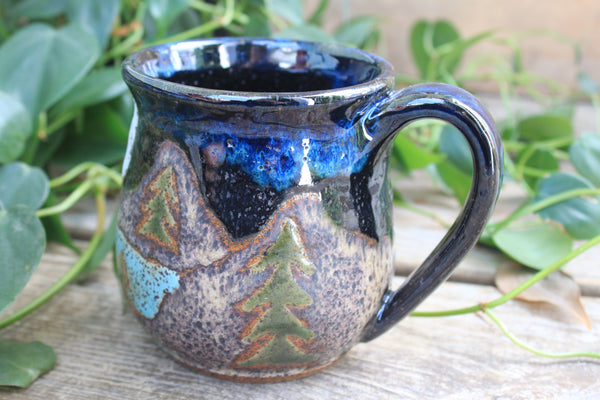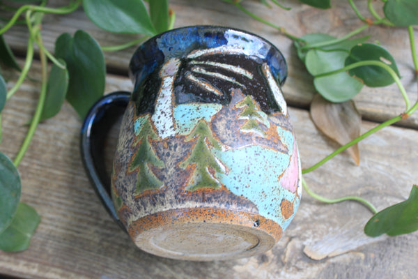 On my 10th birthday, my family drove north along the rocky, rugged coast of Maine, weaving in and out of small fishing towns, to Acadia National Park. It was an adventure full of hiking and icy ocean swims and blueberry pie and I will always love the wild world of coastal Maine. This mug design is in honor of Acadia National Park and all the joy that part of the world has brought me. Featuring a climbing rocky coastal cliff topped by a density of green foliage and a shining lighthouse beneath a setting sun.