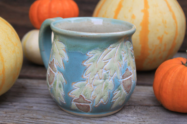 Don’t squirrel away this beautiful acorn mug! Inspired by the changing seasons and our squirrelly friends who are frantically preparing for winter, this mug features several oak tree branches, heavy with acorns waiting to find their squirrel home.