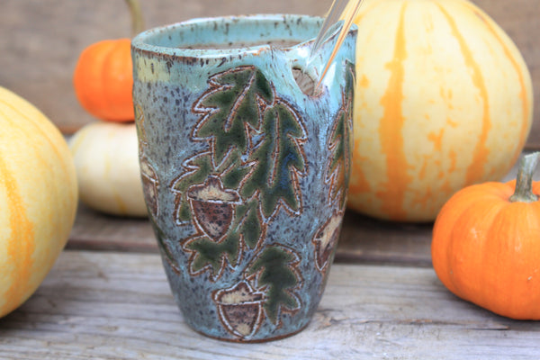 Don’t squirrel away this beautiful acorn mug! Inspired by the changing seasons and our squirrelly friends who are frantically preparing for winter, this mug features several oak tree branches, heavy with acorns waiting to find their squirrel home.