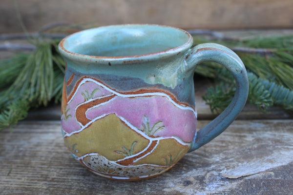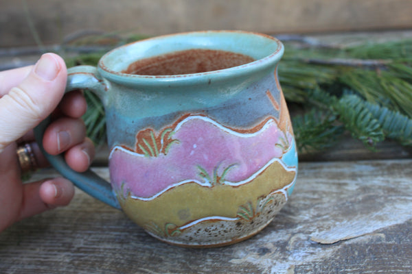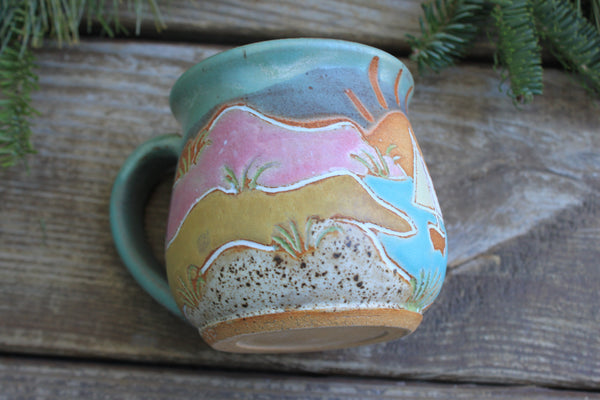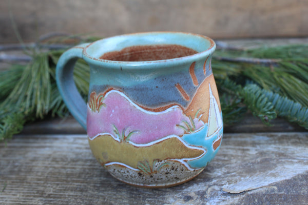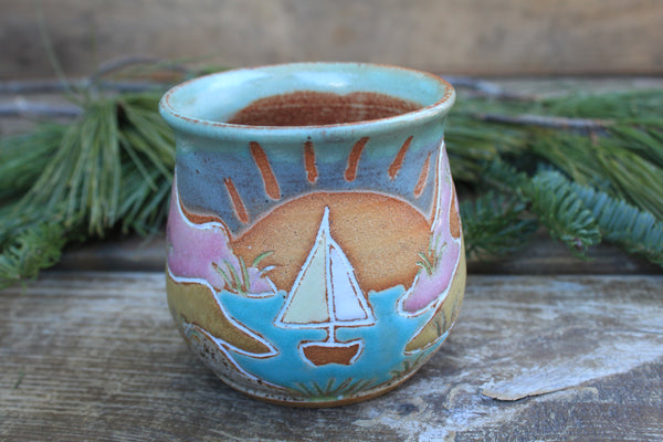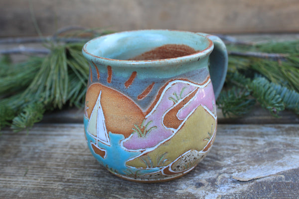 Grab your favorite morning beverage and join me on a long walk through these beautiful rolling sand dunes. This design is inspired by many summer days exploring Cape Cod Bay and the beautiful surrounding area with my nieces. Featuring towering sand dunes and a distant winding path, dune grass waving in the wind, and a large setting sun, this design is sure to transport you to your favorite beachside adventure.