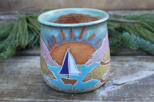 Grab your favorite morning beverage and join me on a long walk through these beautiful rolling sand dunes. This design is inspired by many summer days exploring Cape Cod Bay and the beautiful surrounding area with my nieces. Featuring towering sand dunes and a distant winding path, dune grass waving in the wind, and a large setting sun, this design is sure to transport you to your favorite beachside adventure.