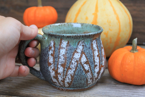 Inspired by a favorite faraway spot in Vermont, this design captures a grove of towering birch trees on a crisp blue day. Let these birches transport you any morning of the week.