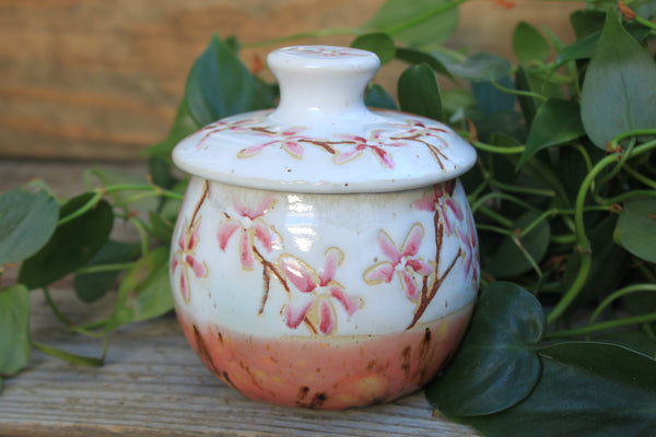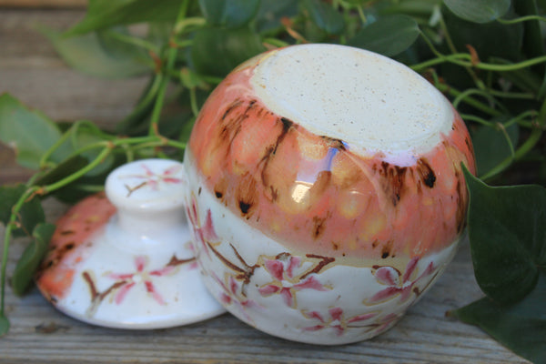This squat, round jar with wheel thrown fitted ceramic lid would brighten up any corner of your home - from kitchen counter to craft space to bathroom. It would be a perfect place to store sugar, or maybe loose buttons, thread, hair pins and elastics, ribbons, cotton swabs - the opportunities are endless!