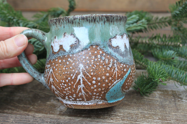 Transport yourself to the high peaks of your favorite mountain range! This glaze design features the wide expanse of a rolling, rugged mountain range on a grey, cloudy, snow day.