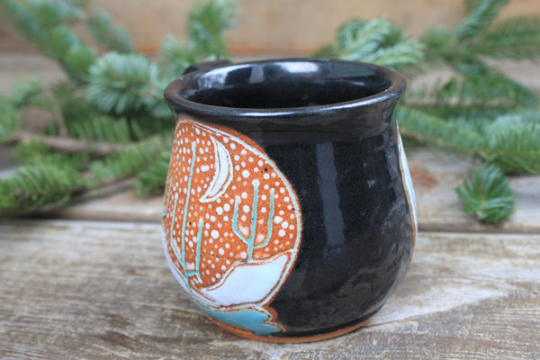 Note: this item is being sold as a second due to a few spots of glaze blisters on the bottom of the mug. The spot has been sanded smooth and does not impact functionality. The price has been reduced accordingly. Please review photos closely prior to purchase.