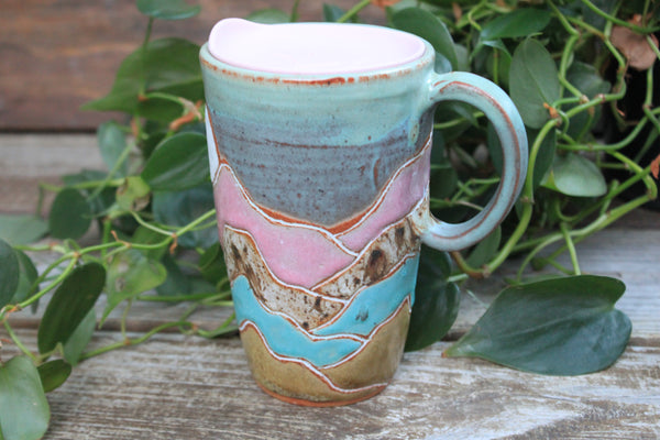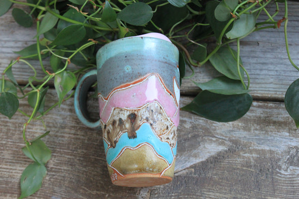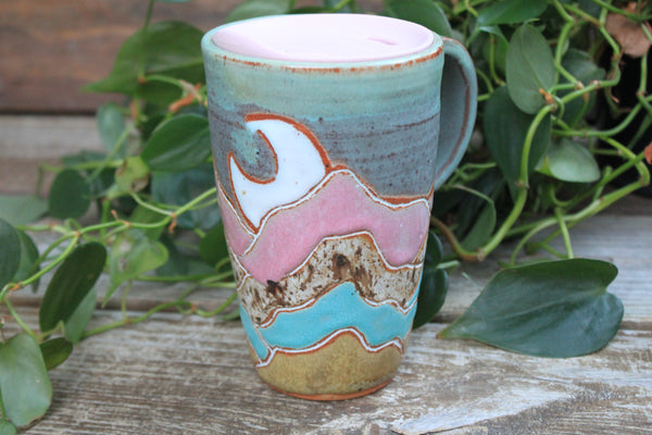 NOTE: This travel mug comes with the pictured pink lid. Lid color can be changed to yellow, grey, or turquoise. Please *EMAIL ME* at beechstreetpottery@gmail.com to request a different color!