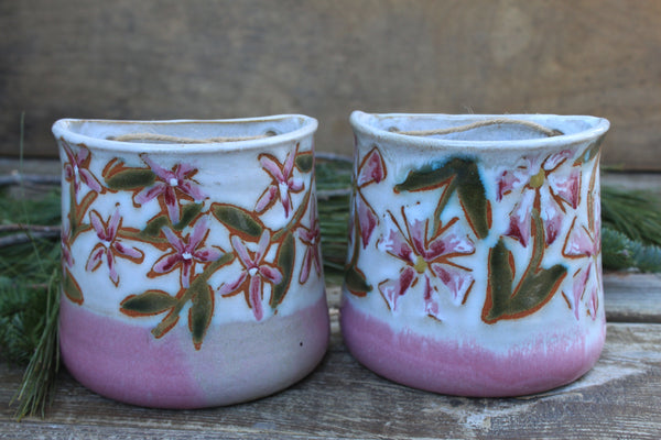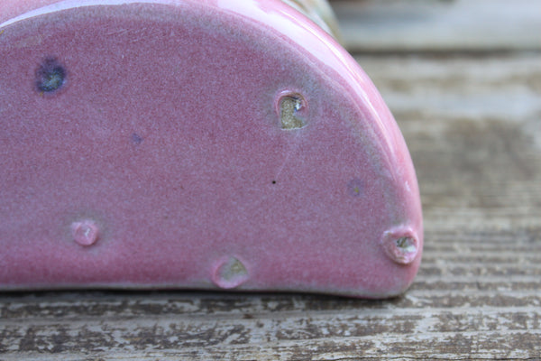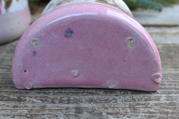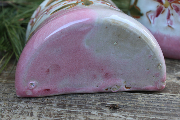 This flat backed vase with two holes is a fun shape that will fit easily into your small spaces or hung on the wall in your favorite cozy corner. Brighten up any part of your home with this sweet piece of functional art!