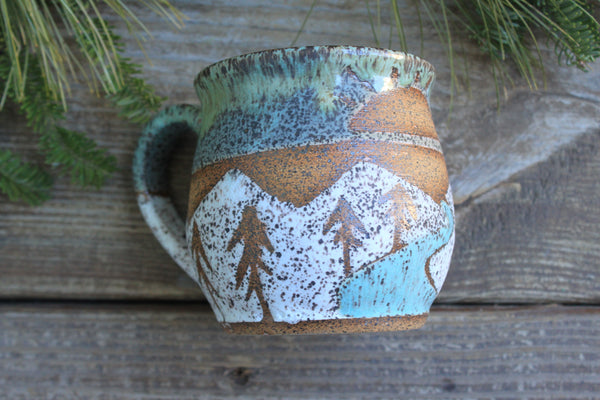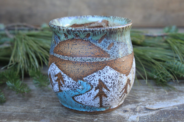 Inspired by a lifetime spent on rivers and in the countryside, this design captures a vibrant river rolling through distant hills beneath a large setting sun. The bright turquoise hue is reminiscent of the vivid lakes and rivers of Glacier National Park, Banff, Yoho, and Jasper, which appear bright turquoise due to the fine rock sediment (or "rock flour") suspended in glacial runoffs.