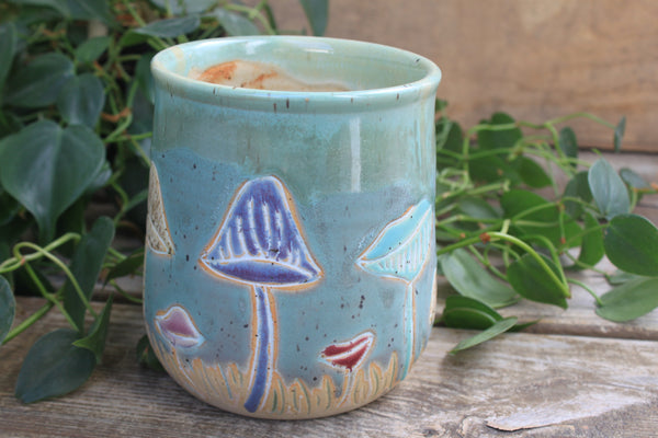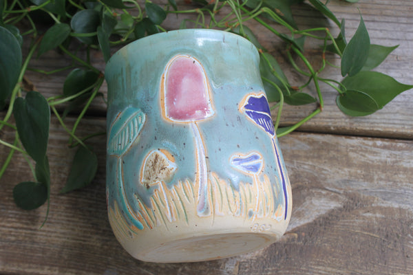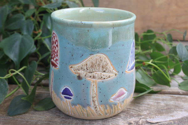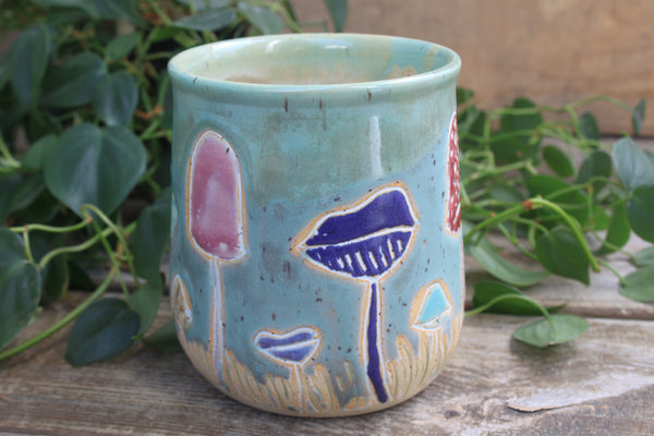 This bright, whimsical mushroom mug vividly captures the beauty of this season of transition. Bring this jar into your kitchen for a bright start to every day! This large crock is perfect as a utensil jar in the kitchen, a plant pot, or a wine cooler to keep your favorite drinks cool on a hot summer night!