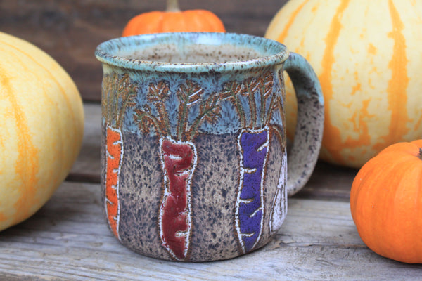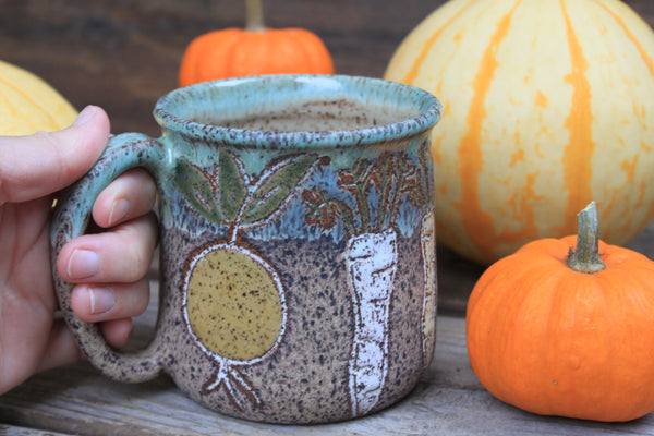 The images you see here are examples of what the items will look like, however please expect variations due to the handmade nature of the pieces. Each item is wheel thrown and hand carved without the use of stencils or decals so each item will be completely unique and one of a kind. Each design will feature a white garlic clove on one side of the handle and a red or golden beet on the other