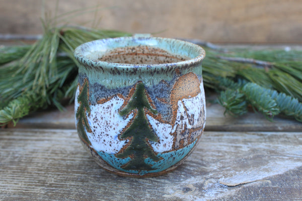 An homage to many cozy winter cabin trips and hours spent watching the snow swirl around distant birch trees, cozy up with this mug and dream of waking up in this inviting cabin nestled among a soft heavy snowfall.