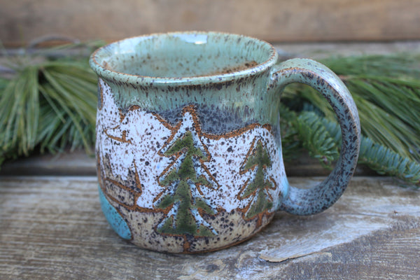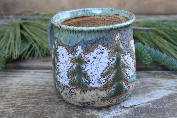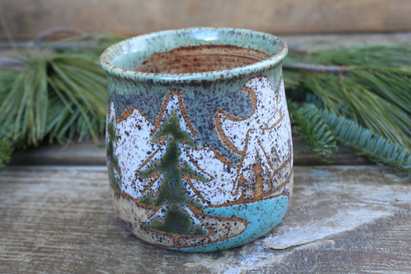 An homage to many cozy winter cabin trips and hours spent watching the snow swirl around distant birch trees, cozy up with this mug and dream of waking up in this inviting cabin nestled among a soft heavy snowfall.