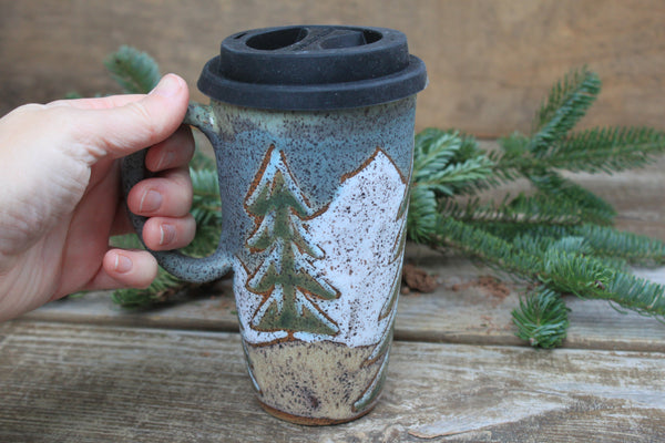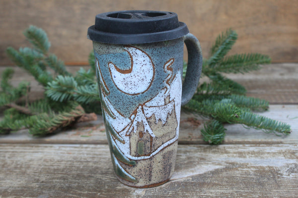 Inspired by brisk mornings wandering in a frosty forest landscape, this mug captures the joy and beauty of a day spent steeped in fresh forest air. The towering evergreens flank a cozy snowy cabin and turquoise lake. This rustic, speckled mug is sure to transport you to peaceful getaway even on your busiest morning.