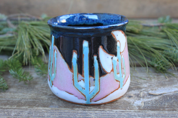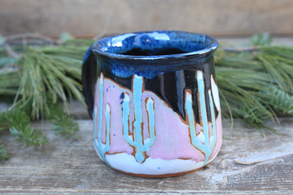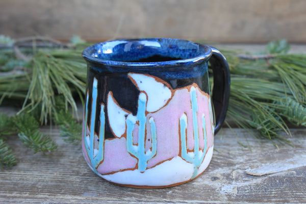 Wrap your hands around a mug of winter in the desert. This design features a high shining sun over distant snowy mountains and a collection of cactus.