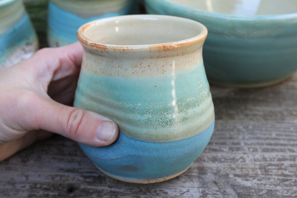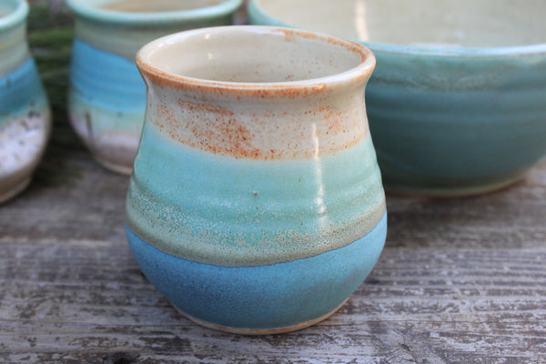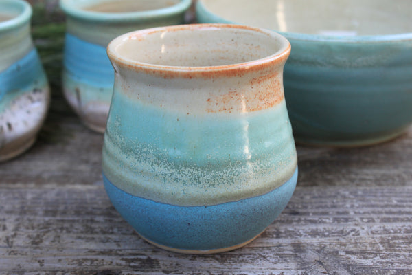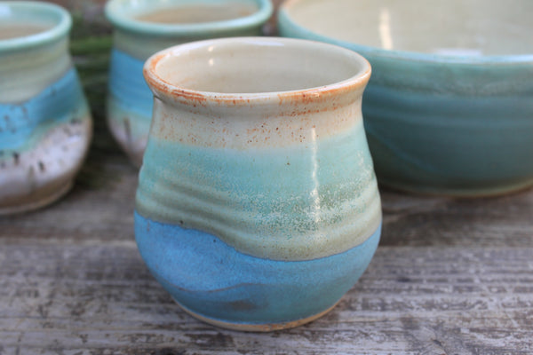Inspired by hot and humid evenings spent on Cape Cod Bay, this glaze combination captures a vibrant turquoise ocean stretching into the expanse topped by a soft misty greyish turquoise. Melt into this striking glaze combo and dream of summer days.